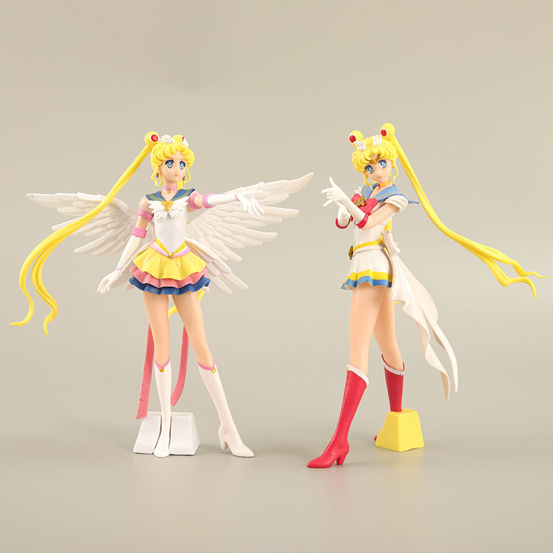2種類の美人の戦士の手はアニメの漫画の翼を作って月の野ウサギのぬいぐるみのおもちゃの置物を結びます。