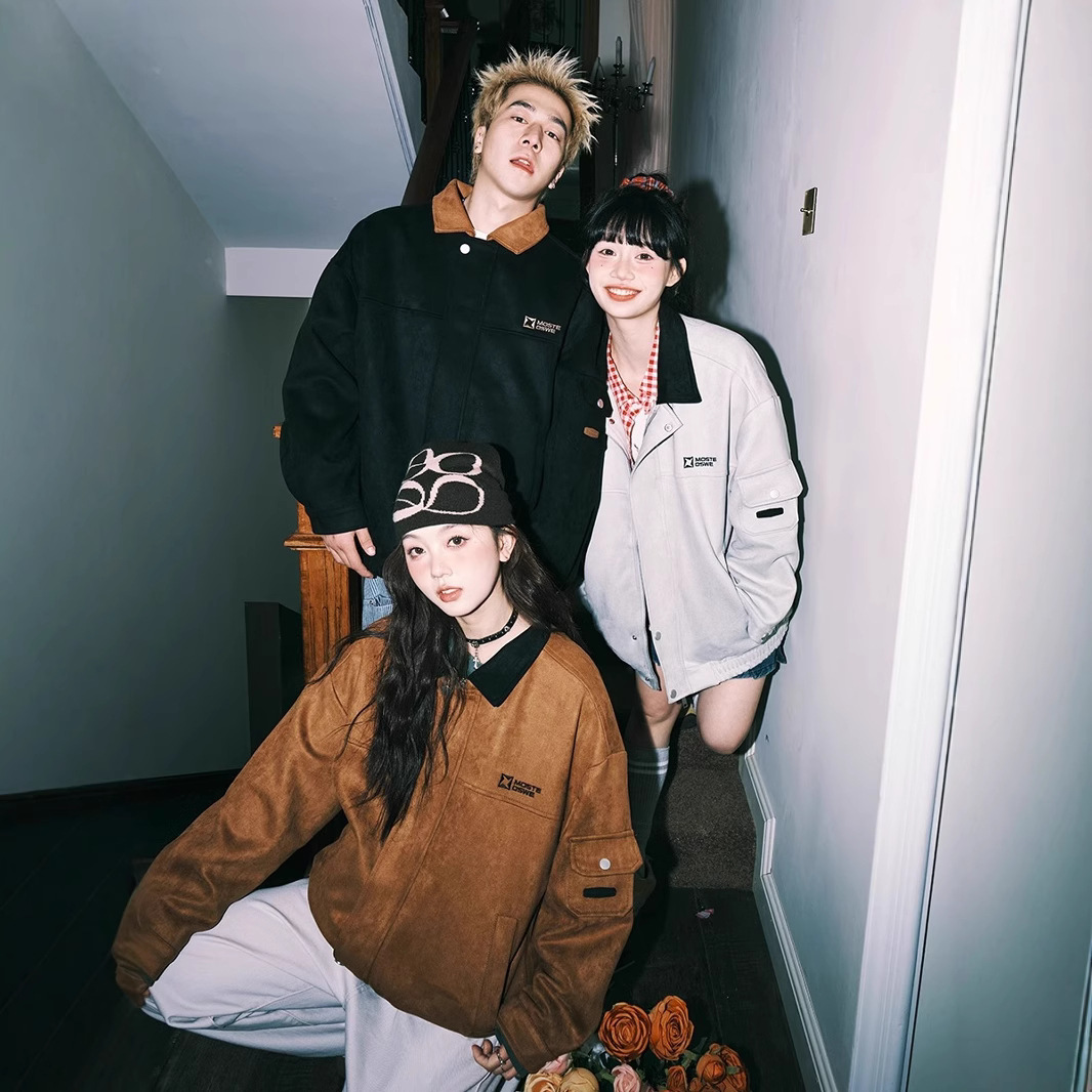 Lemanism潮牌衝突色スエード工装コート男2025春新作カップルジャケットゆるい上着