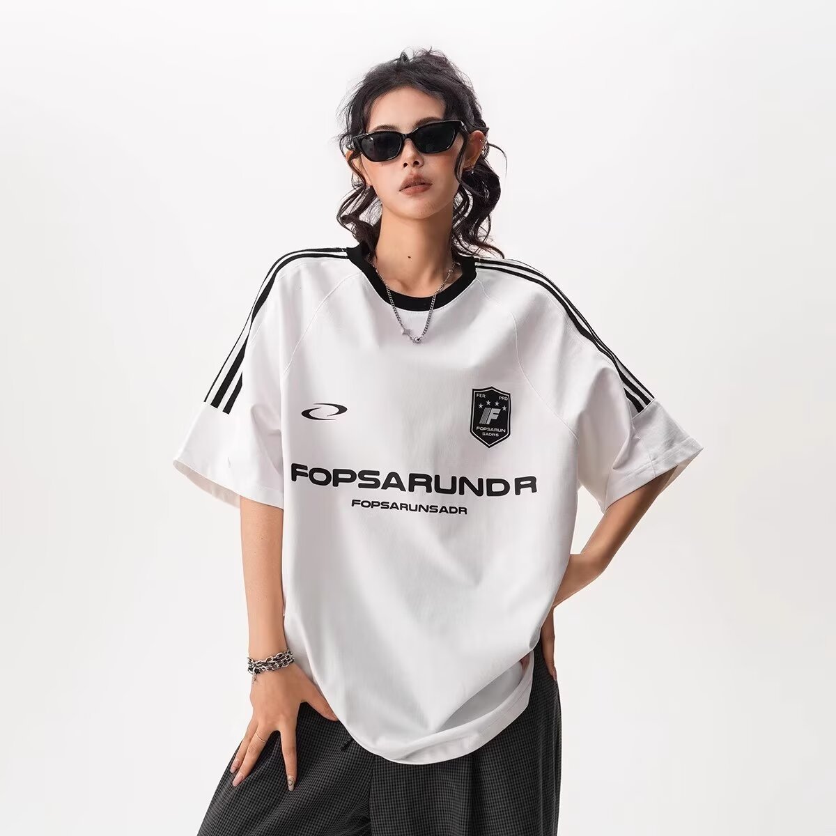 アメリカンレトロな3ストライプウェビング半袖Tシャツ、女性と男性用、夏のトレンディなブランド、ルーズカレッジスタイルのスポーツカップルトップス