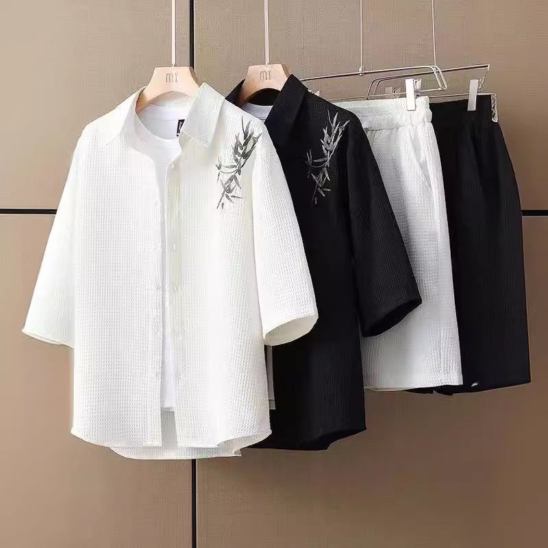 夏のスーツのワッフル半袖シャツの男性の服の竹の葉の刺繍の5分のズボンのゆるい潮のブランドの2つのセット