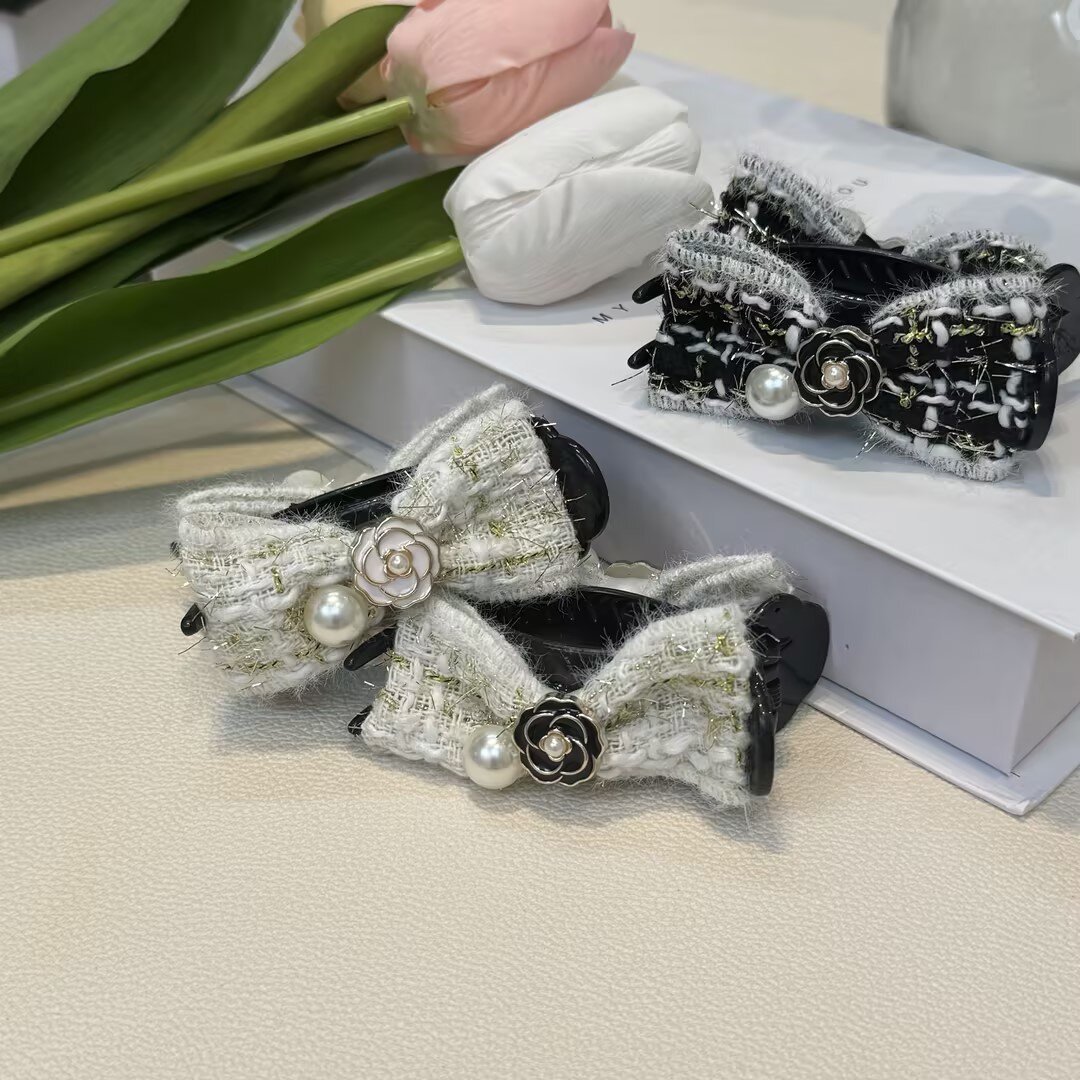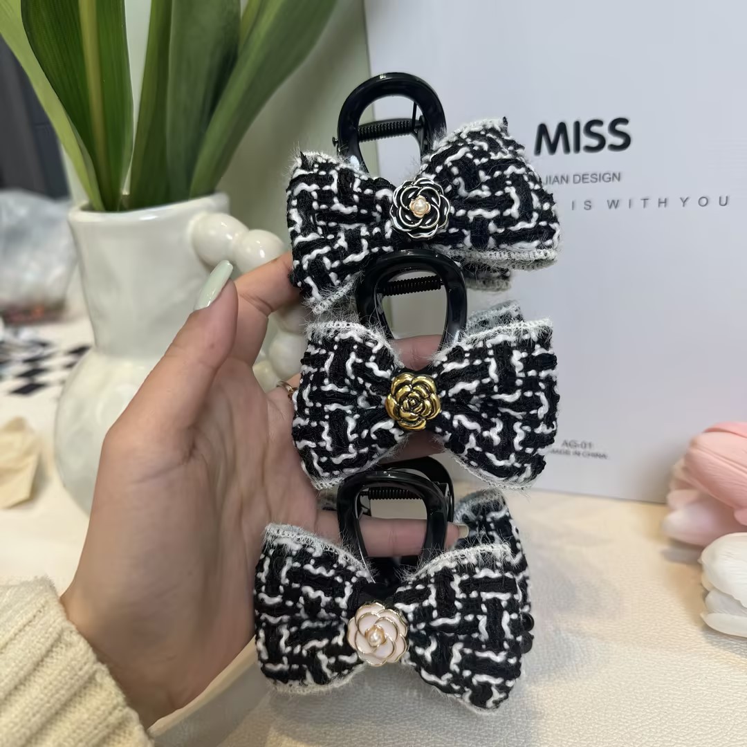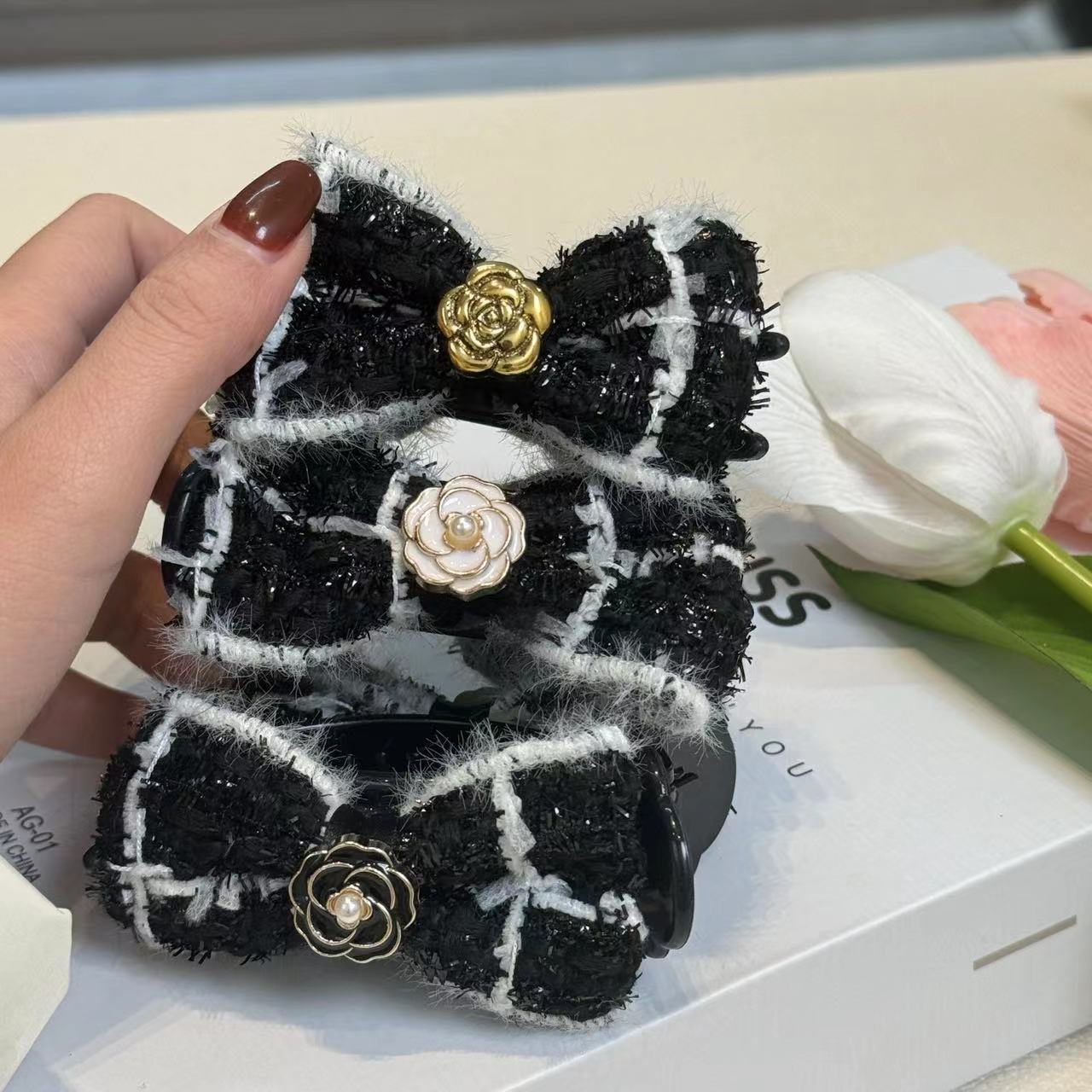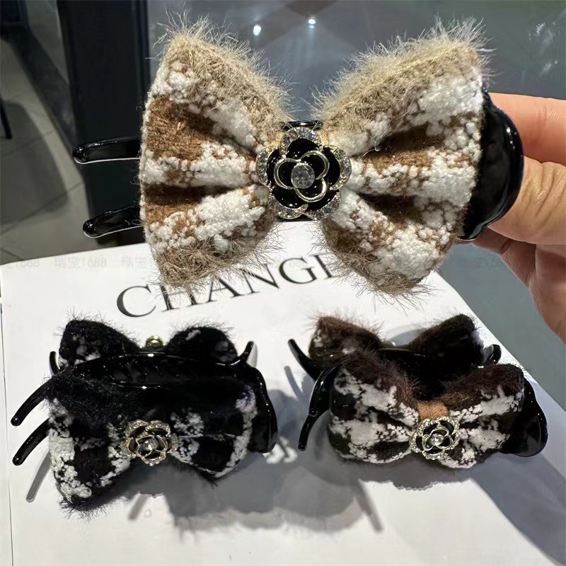 秋冬毛尼小香風格子山茶花立体蝶結び髪飾りファッション