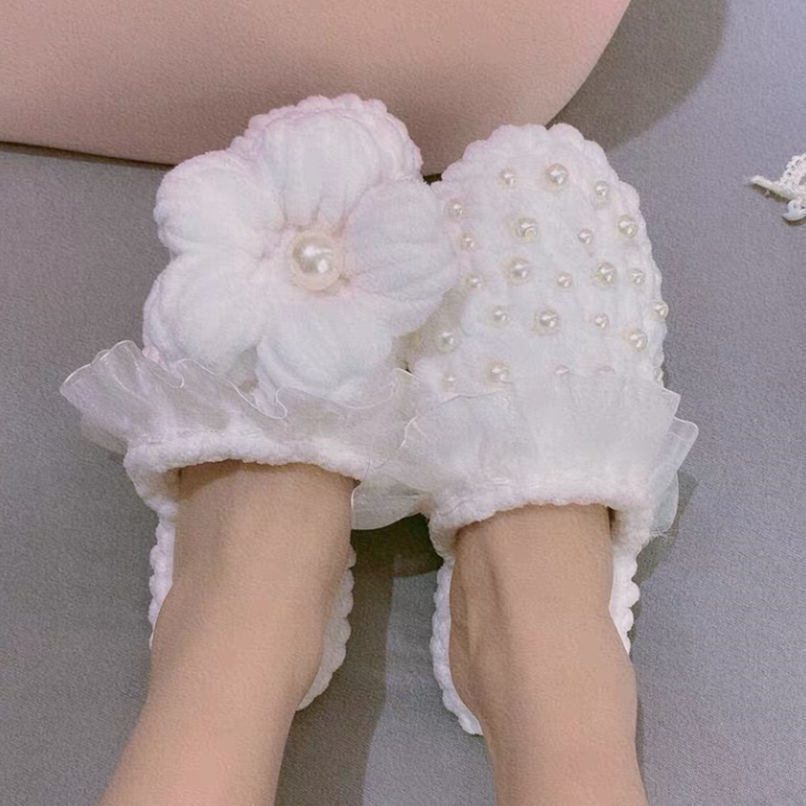 ネット赤シュークリーム花スリッパ真珠diy手編みかぎ針シュークリーム靴材料バッグレース冬スリッパライン