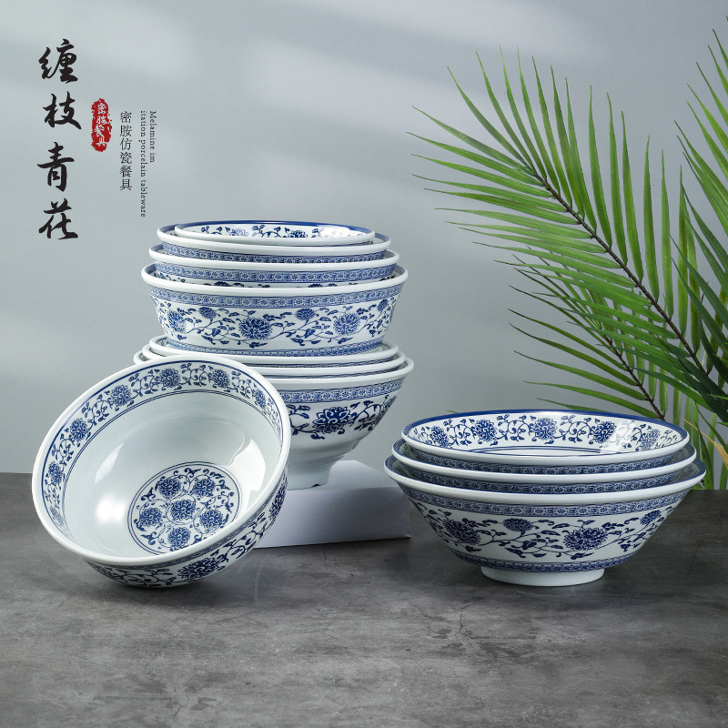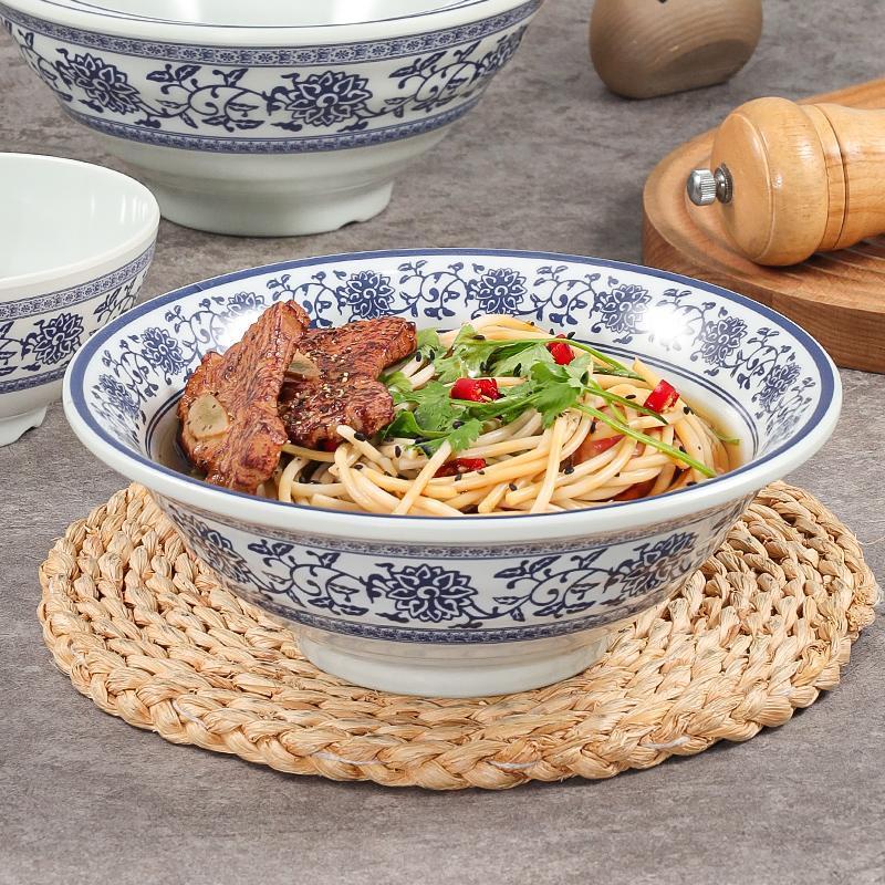 メラミン青白模造磁器ヌードルボウルプラスチック大ボウルスープボウル牛肉ラーメンボウルスープパウダーボウル笠ライスボウルレストラン商業用