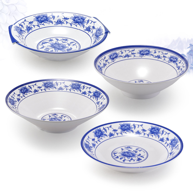 メラミン青と白の耳のそばの麻辣香鍋ホテルは磁器の酸っぱい魚の大きい碗の麻辣热スープの碗の商用食器をまねます。