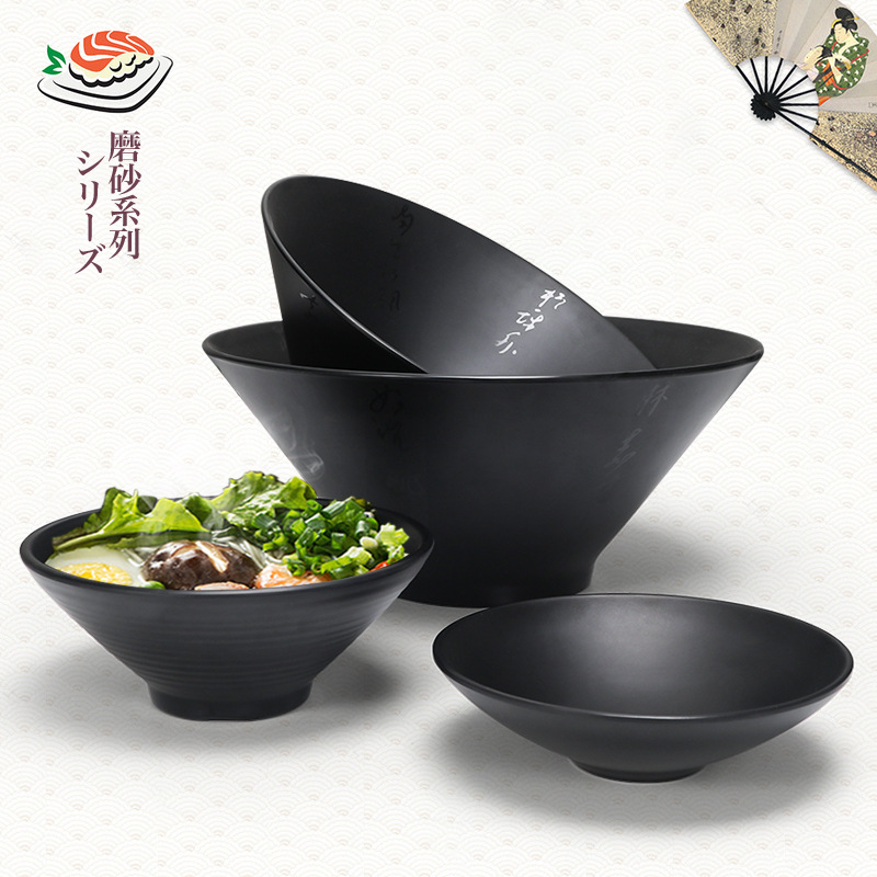 メラミンラーメンの業務用日本式の闘笠碗の黒い模造磁器のプラスチックスープの碗の大きい口の碗の浅い碗の冷たい皮は麺の碗をかき混ぜます