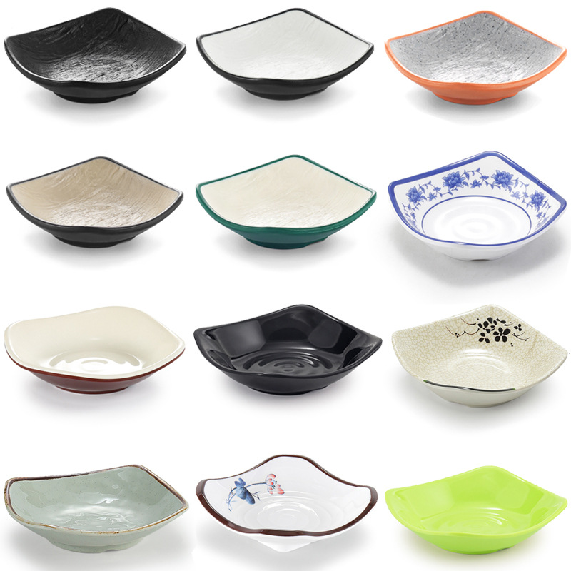 台湾のメラミン小皿は磁器の四角形のプラスチックの冷たい料理の皿の軽食の調味料の皿の醤油の酢の皿をまねて商用します。