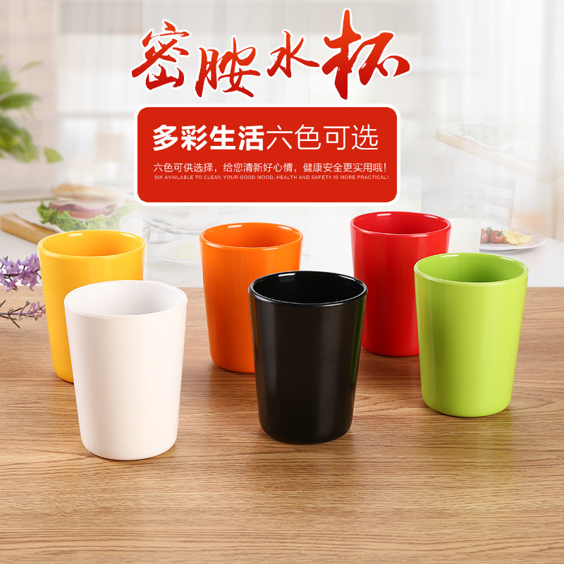 メラミンのコップのカラーのプラスチックのコップは水を飲みます。