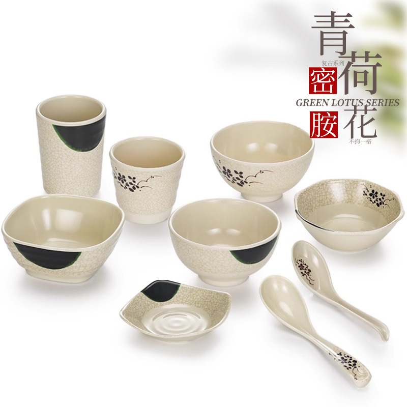 メラミンのファーストフードの食器皿は磁器の食器の食堂の鍋のホテルをまねて台の小さい碗の皿のプラスチックの杯のスプーンを並べて商用します。