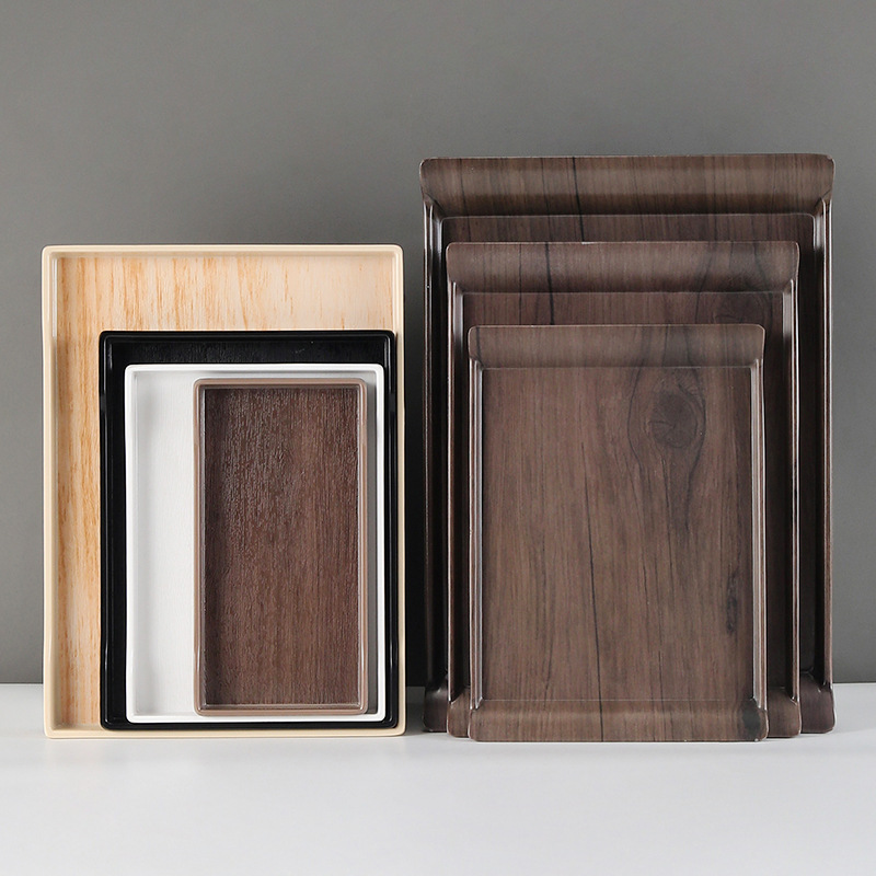 凱柏雅トレーの長方形のプラスチックの皿のお茶のコップの皿は木目のパンに似せて業務用の食事の皿を展示します。