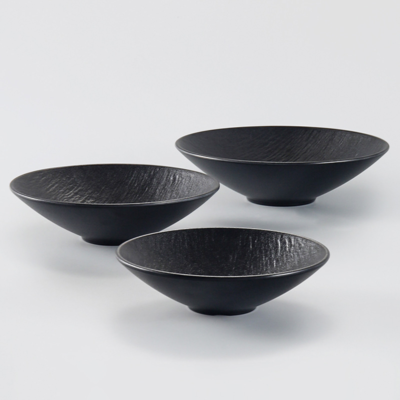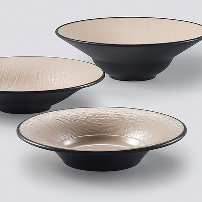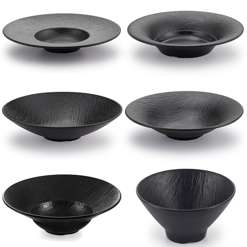 台湾のメラミンの黒い浅い口の碗の笠の鋭い底のサラダの碗の冷たい皮の練麺の碗の料理の碗の日本式の商用利用