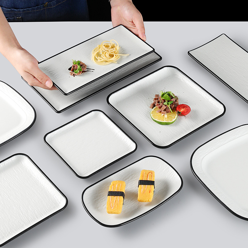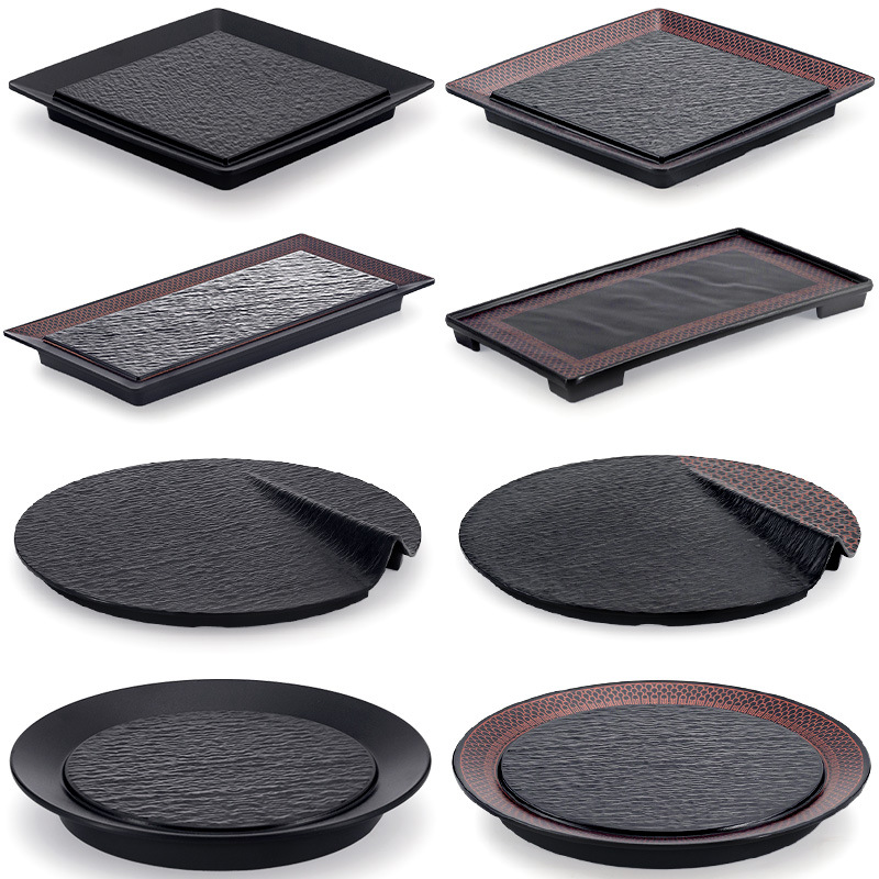 メラミンの皿の黒いプラスチックの平皿の鍋の店の料理の皿の日本式の寿司の皿の焼肉の皿のステーキの食事の皿の商用化