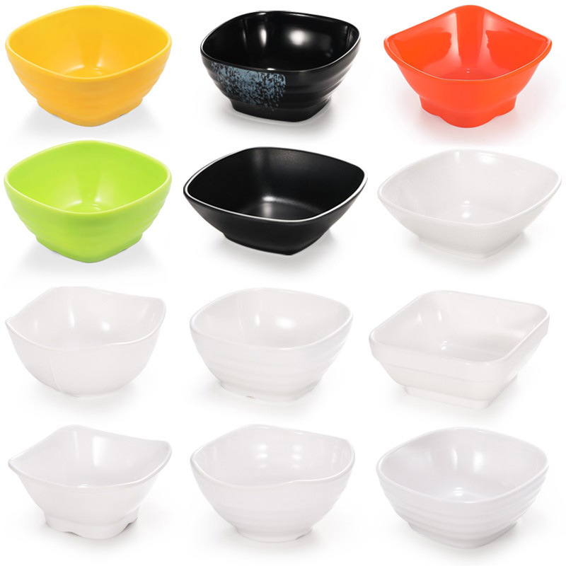 メラミンの茶碗の四角形のプラスチックの小さい碗の鍋の調味料の碗は磁器の食器のファーストフードのおかゆの碗のスープの碗の四方の碗の商用化に似せます。