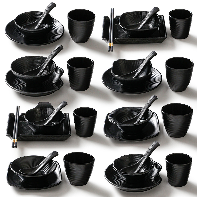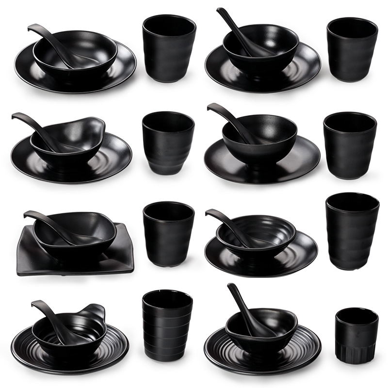 テーブルメラミン食器鍋レストランホテルレストランテーブルセット4ピース商業黒模造磁器食器とカップセット