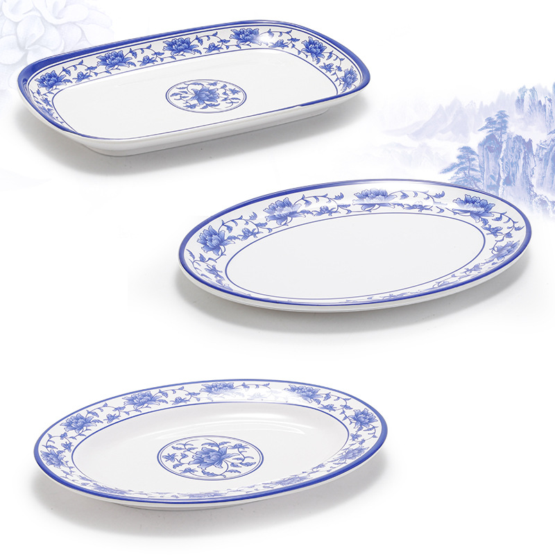 メラミン青と白の模造磁器プレート鍋バーベキュープレート楕円形の魚プレートクリエイティブホテル冷菜プレート炒め物プレート商業用