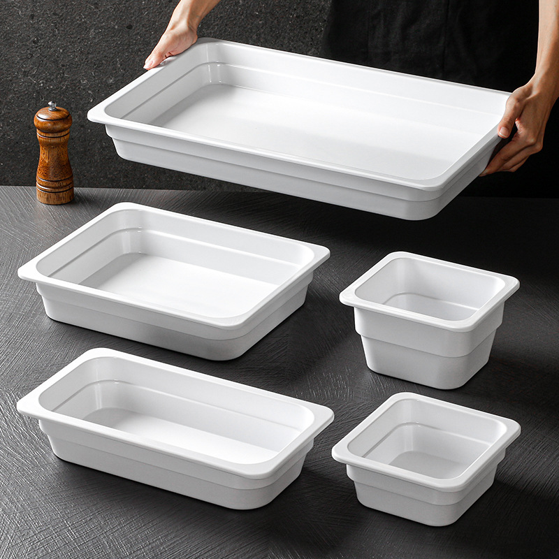 テーブルメラミン食器、煮込みディッシュ、業務用模造磁器食堂ファーストフードレストランビュッフェトレイ、模造磁器ディッシュ