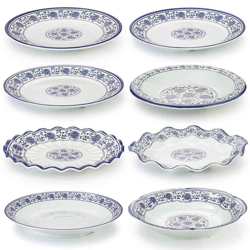 メラミンレトロ青と白の磁器プレートクリエイティブレストランレース調理プレート深皿スーププレート商業プラスチック円盤