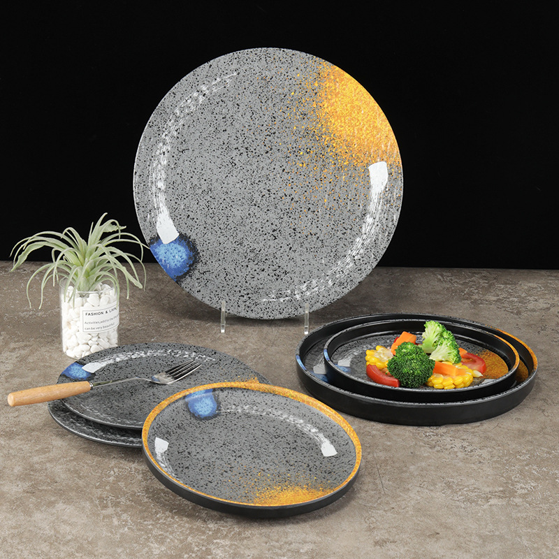 メラミン模造磁器プレートラウンドレストラン洋食プレートステーキプレート鍋プレートプラスチックラウンドプレートクリエイティブフラットプレート商業用