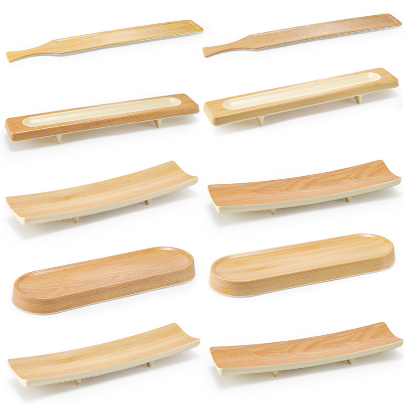 メラミン木目鍋牛肉ミートボールロングプレート寿司プレート長方形エビスライド模造磁器商業プラスチック食器