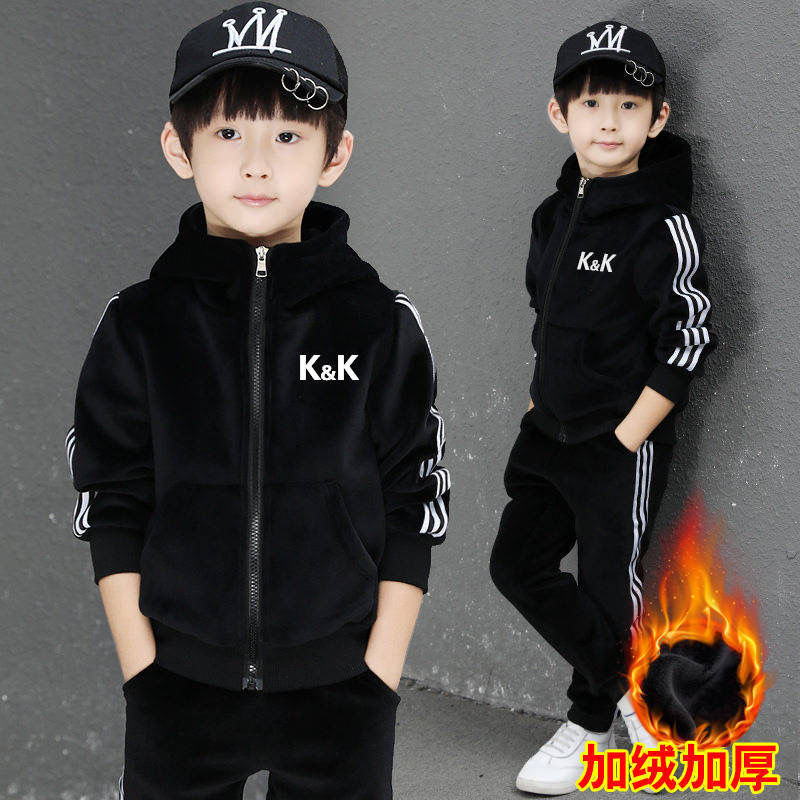 男の子の両面にベルベットの厚手のベルベットのスーツの中の子供のジッパーのカーディガンのスポーツカジュアルな冬服の2つのセット