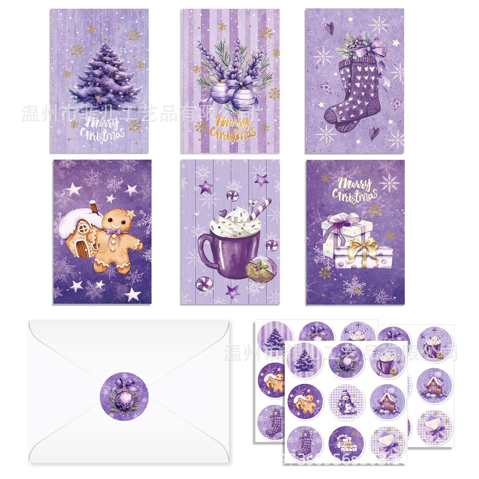 HK073 パープルクリスマスカードグリーティングカード大人と子供のためのグリーティングカード封筒セットホリデーグリーティングカードステッカー