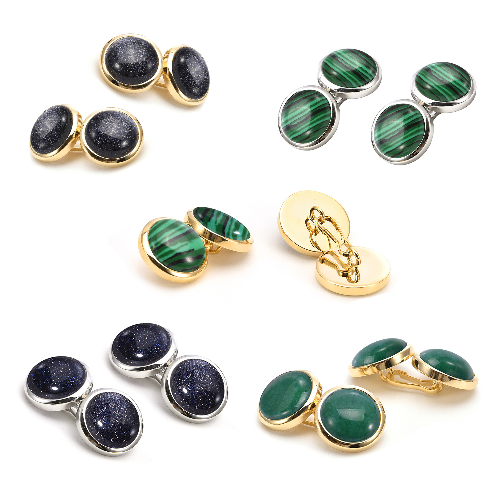 東莞の現物の円形の天然の宝石のフランスの袖のチェーンのカフスの両面のチェーンの青い砂の石の袖のチェーンはピーコックの石のボタンを掛けます