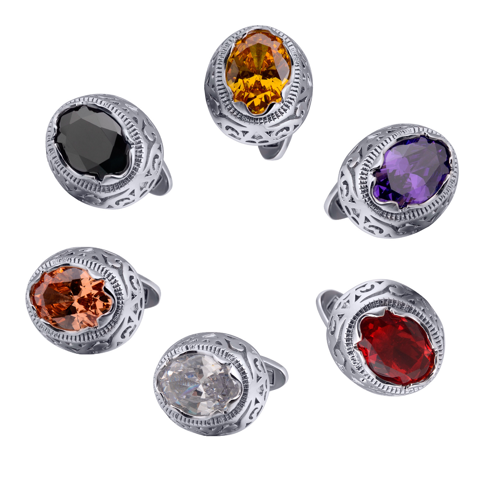 男性のハイエンドの透かし彫りの白い黄色の紫の黒色のジルコンのカフスは楕円の鳩の卵の宝石のカフスを掛けます。