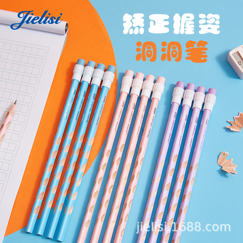 ジェリス三色穴ペン消しゴム持ち手矯正写字絵ペン児童生徒用hb鉛筆12本