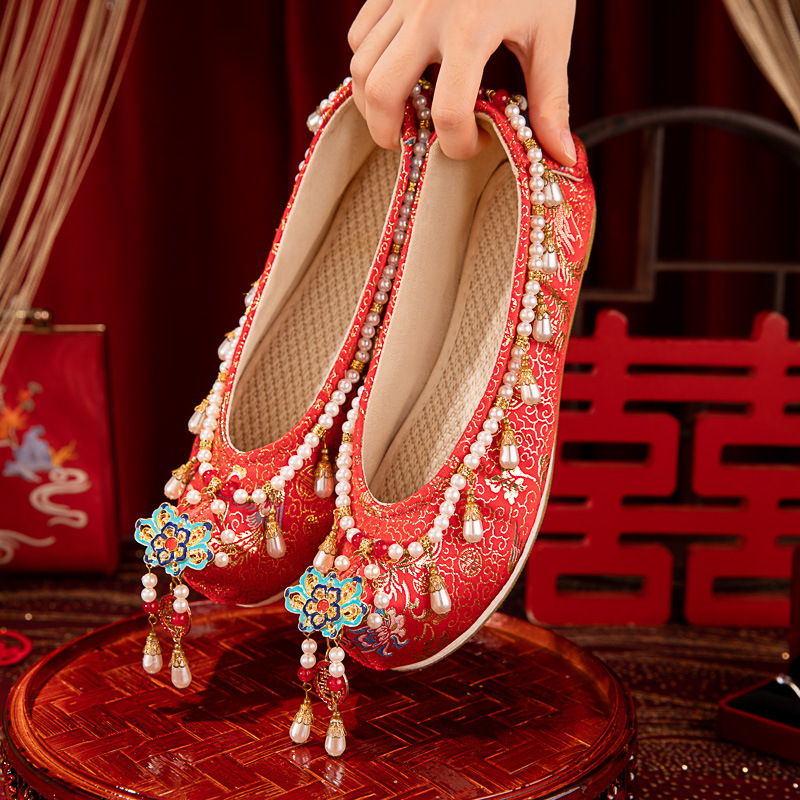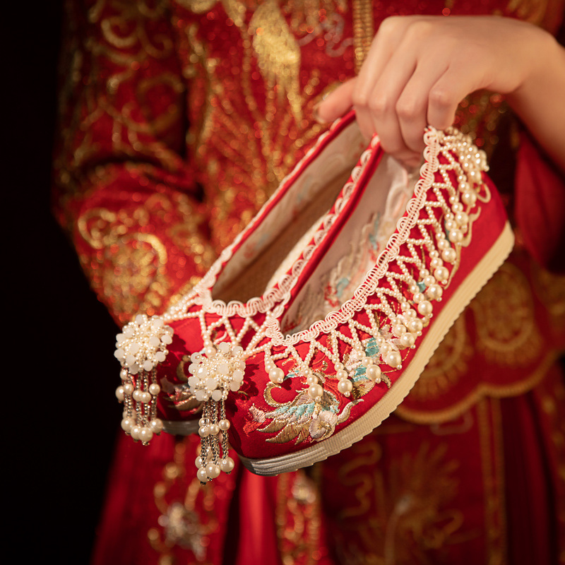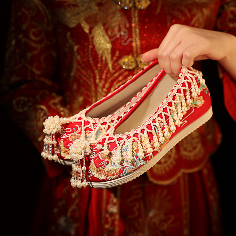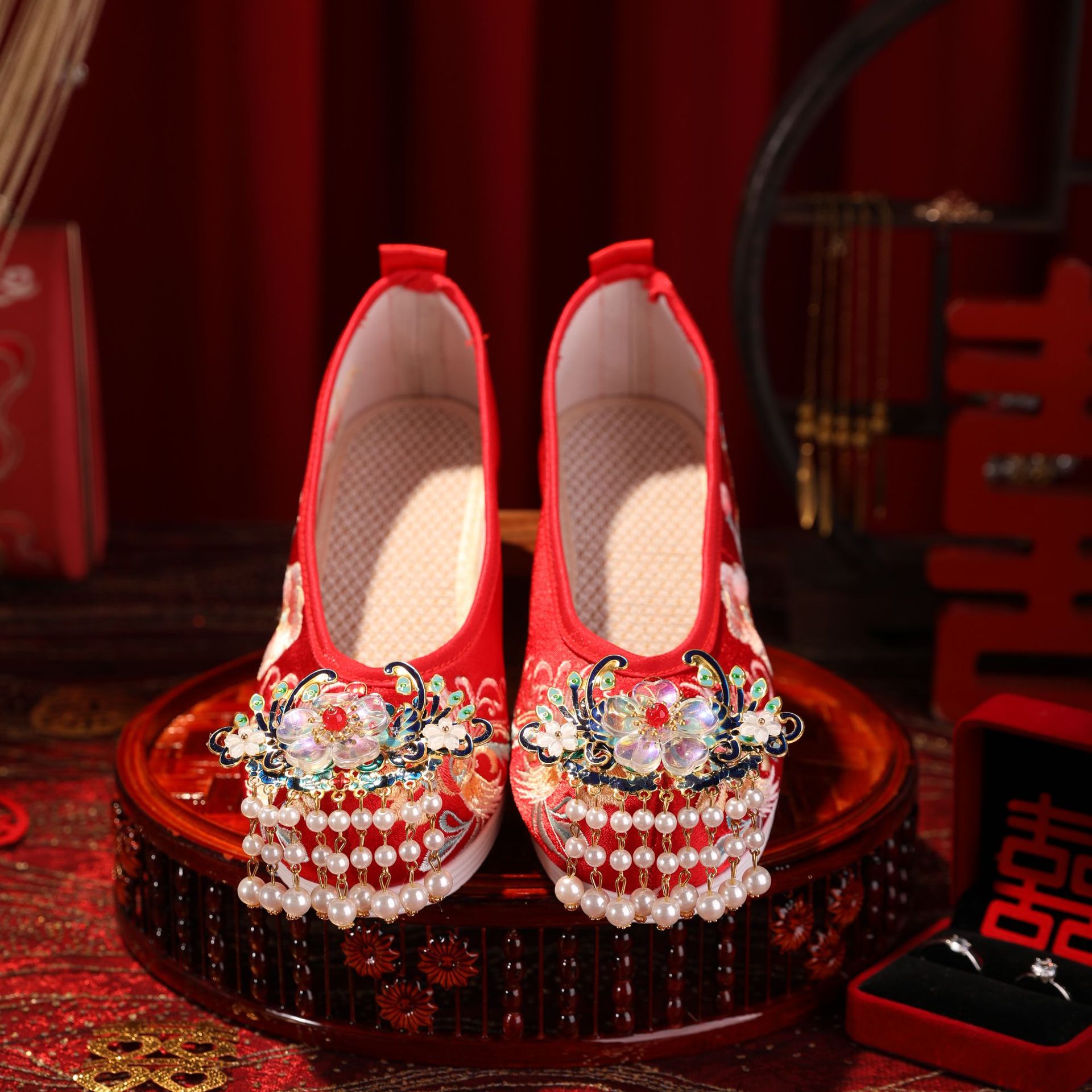 今世の良縁2024夏秋の新型中国式花嫁結婚流蘇手作り古風刺繍靴秀禾漢服靴
