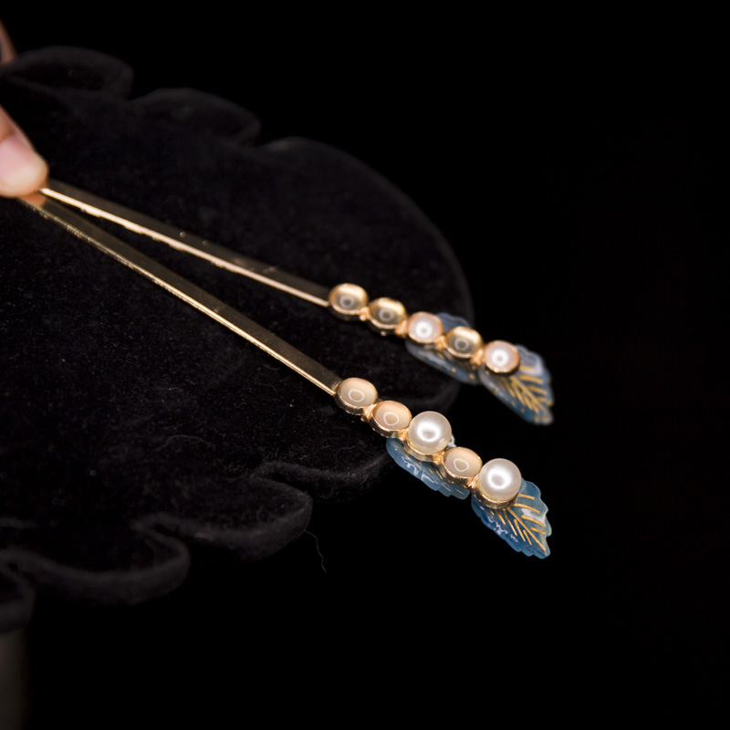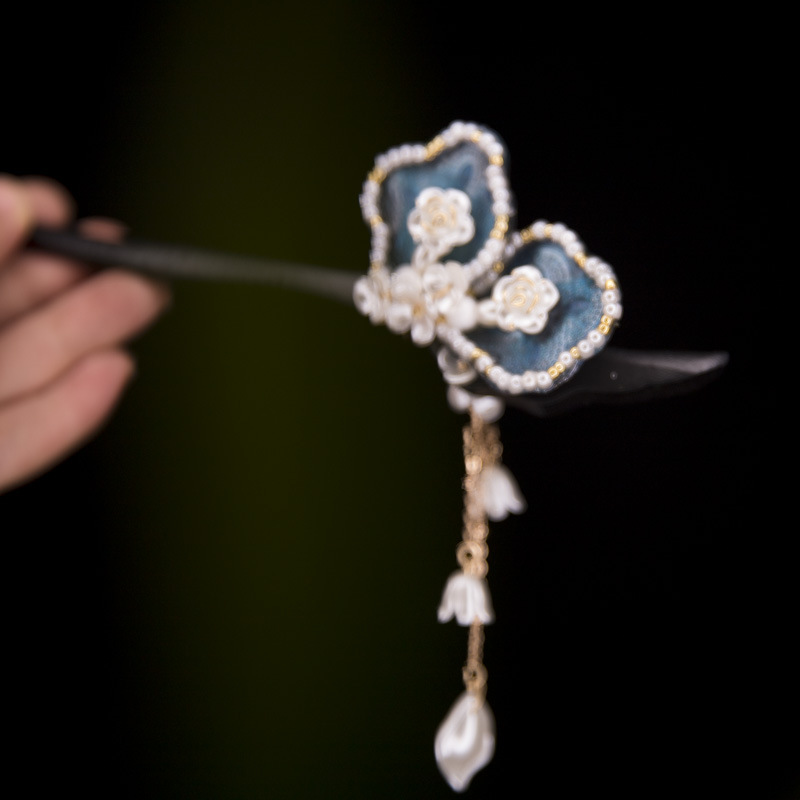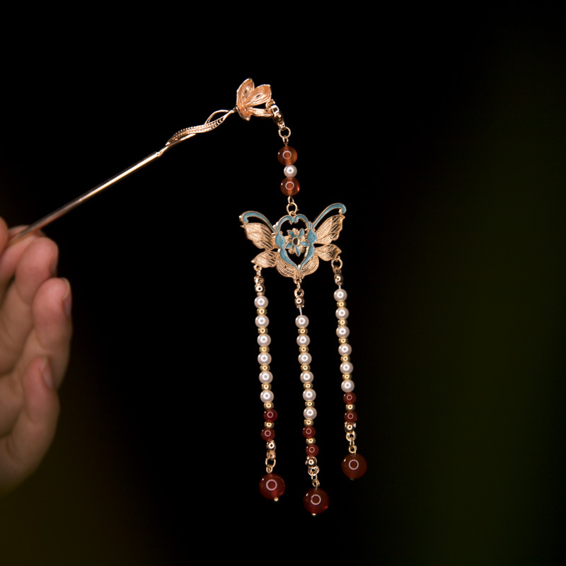 煙霞新中国風採蓮帰焼藍蝶真珠流蘇漢服アクセサリー日常盤髪長型ヘアピン