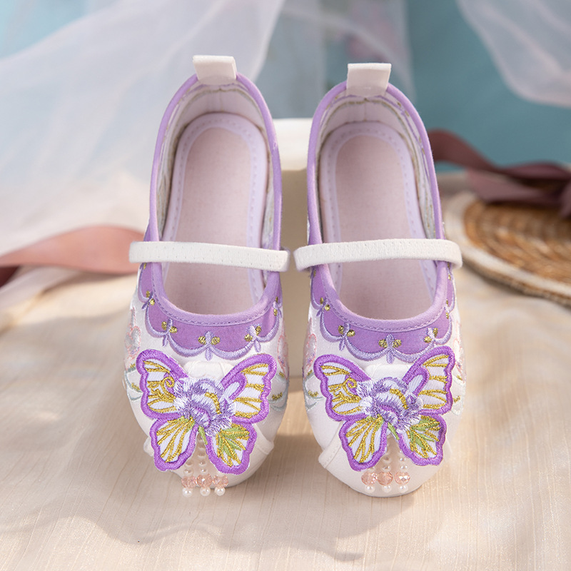 蝶影2024春の新型子供古風老北京布靴赤ちゃん演技靴中国風紫色漢服靴