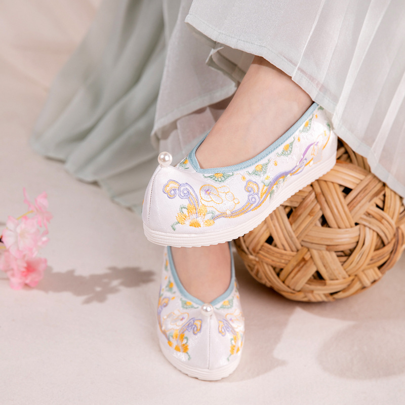 念芯2024春の新型の丸い頭の真珠の刺繍の単靴の明製は古風の布の靴の時代の服装の漢服の靴を改良します。