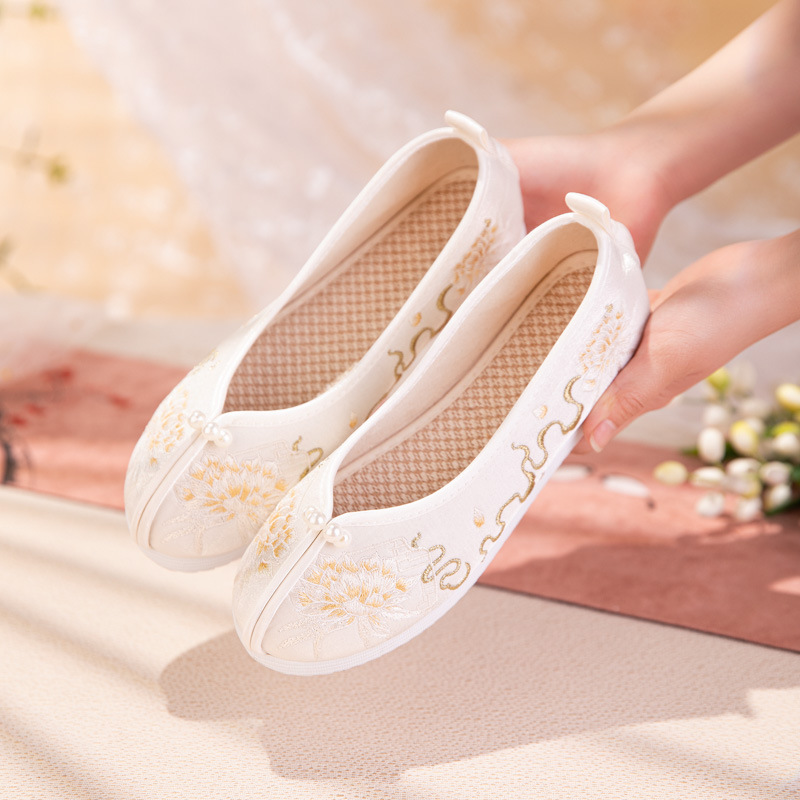 Huazhong 2025 春と夏の新しいスタイルのスーパー妖精漢服の靴女性の古代スタイルの平底刺繍靴と漢服の靴