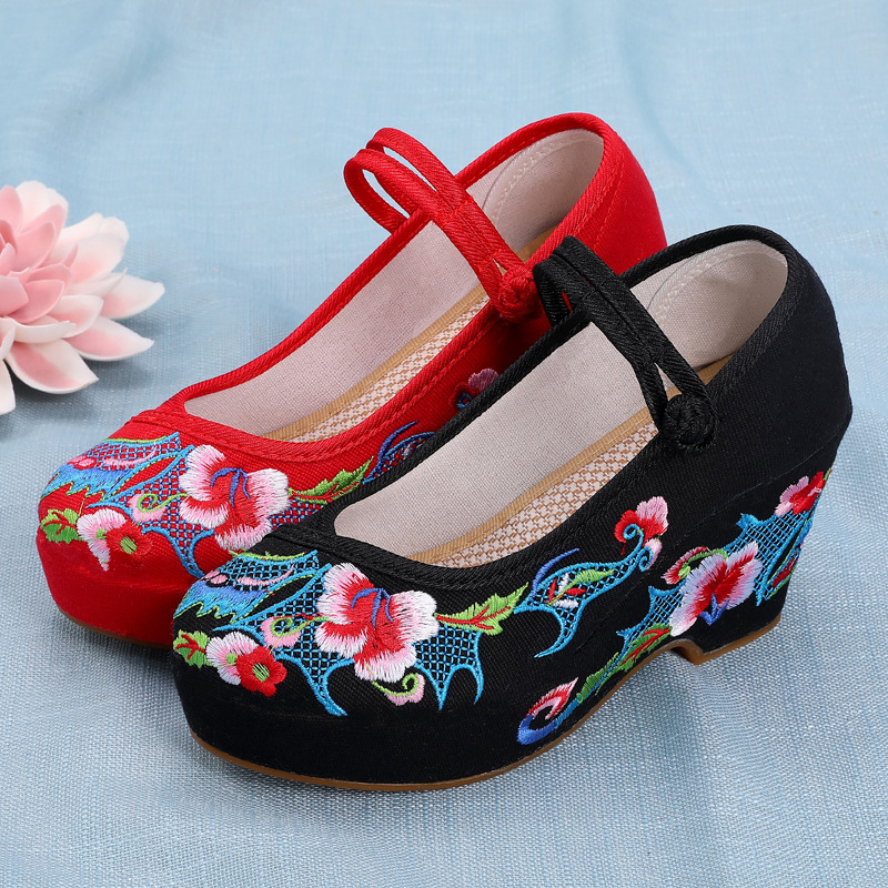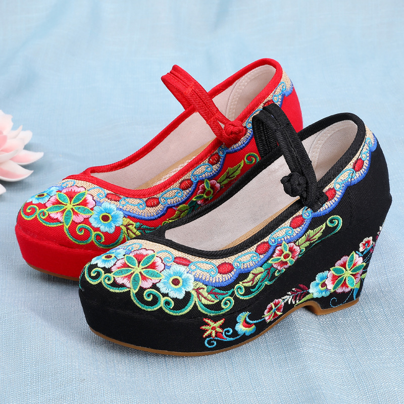 飛燕草復古民族風坂と刺繍布靴の女性8センチのハイヒールの赤いキャンバスの女性靴