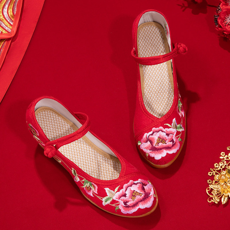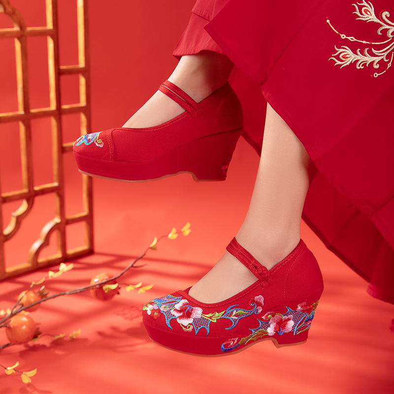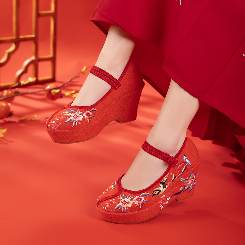 結婚靴ハイヒール中国風秀禾靴赤色新民族風刺繍ひも布靴