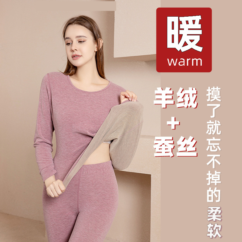 新型秋冬ab面カシミヤシルク保温下着男女セット丸襟秋衣秋ズボンケースY-2275