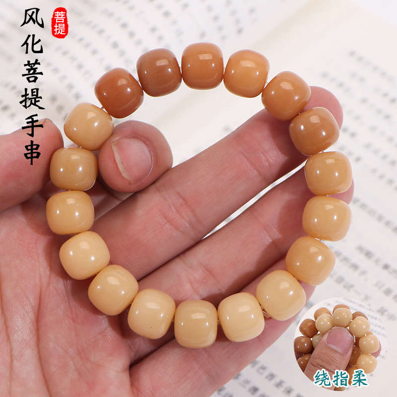 風化菩提根手串黄色グラデーション指柔白玉菩提男女老型桶玉手持ち盤で遊んでいます。