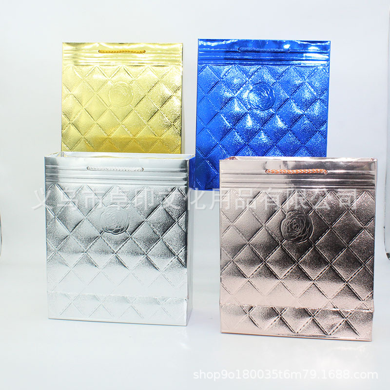 シンプルなインソリッドカラーの光沢のある4色のホリデーギフトバッグギフトコンパニオン包装袋ショッピングバッグゴールドとシルバーのボール紙バッグ