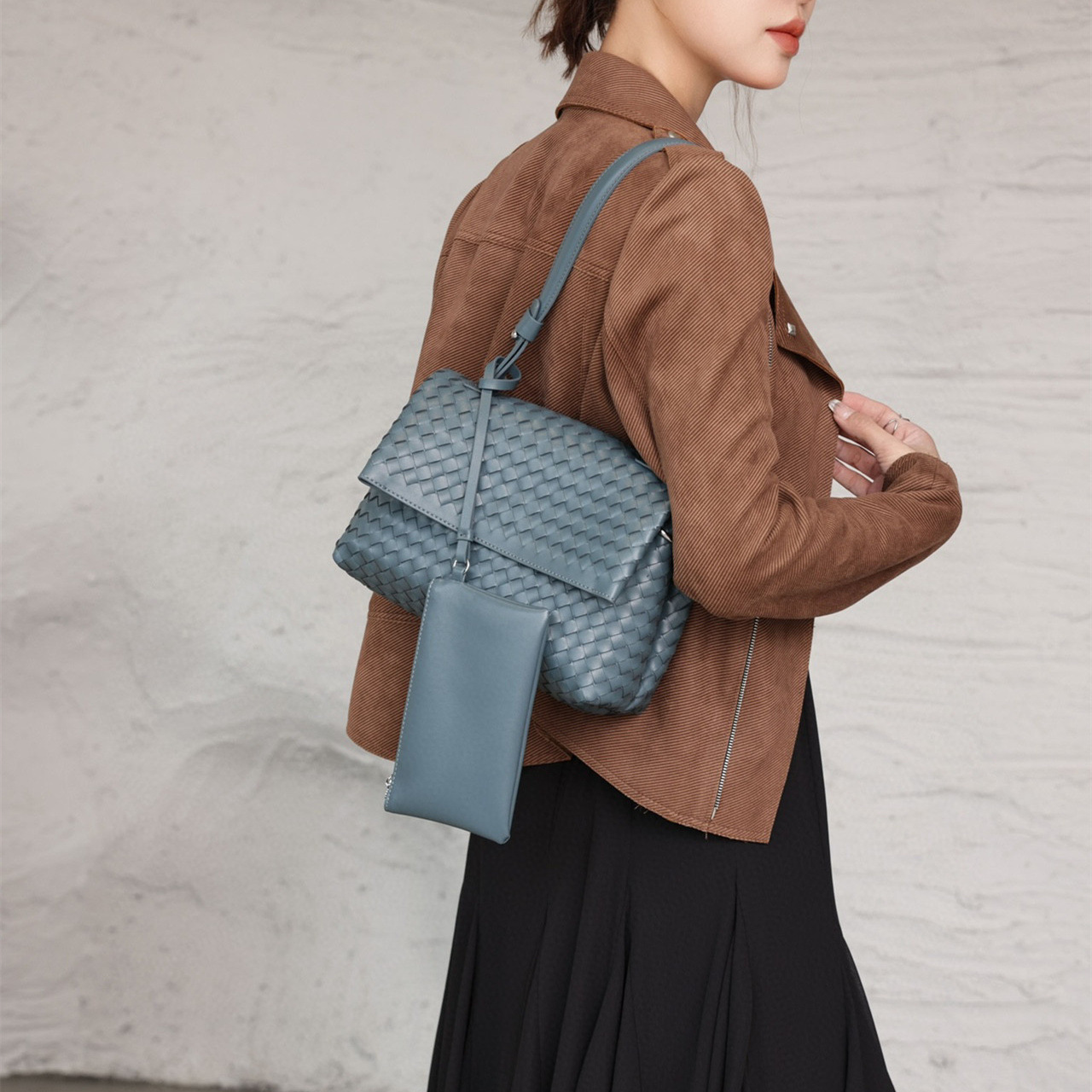 本革牛革編みバッグ文芸女性カバンシングル肩バッグデザイナーの個性的な細い肩ベルトシンプルな縦型バッグ
