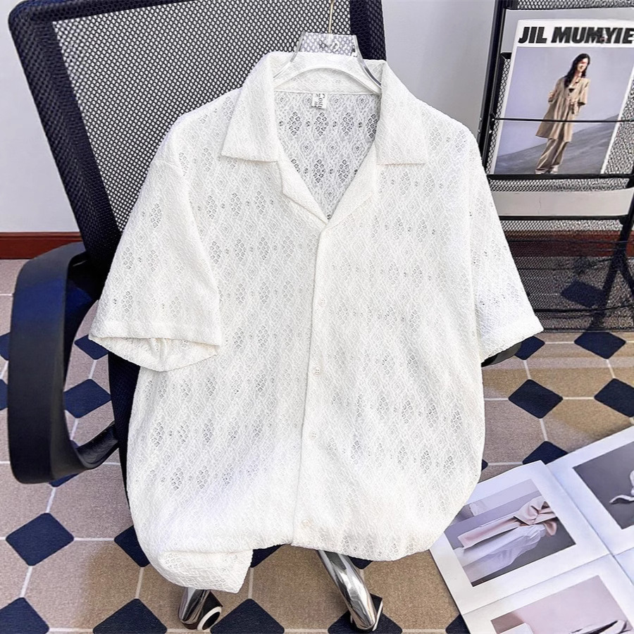 男性と女性のための薄い通気性のある中空半袖シャツ、韓国の高級キューバンカラーの五分袖シャツ、夏のトレンディなトップス
