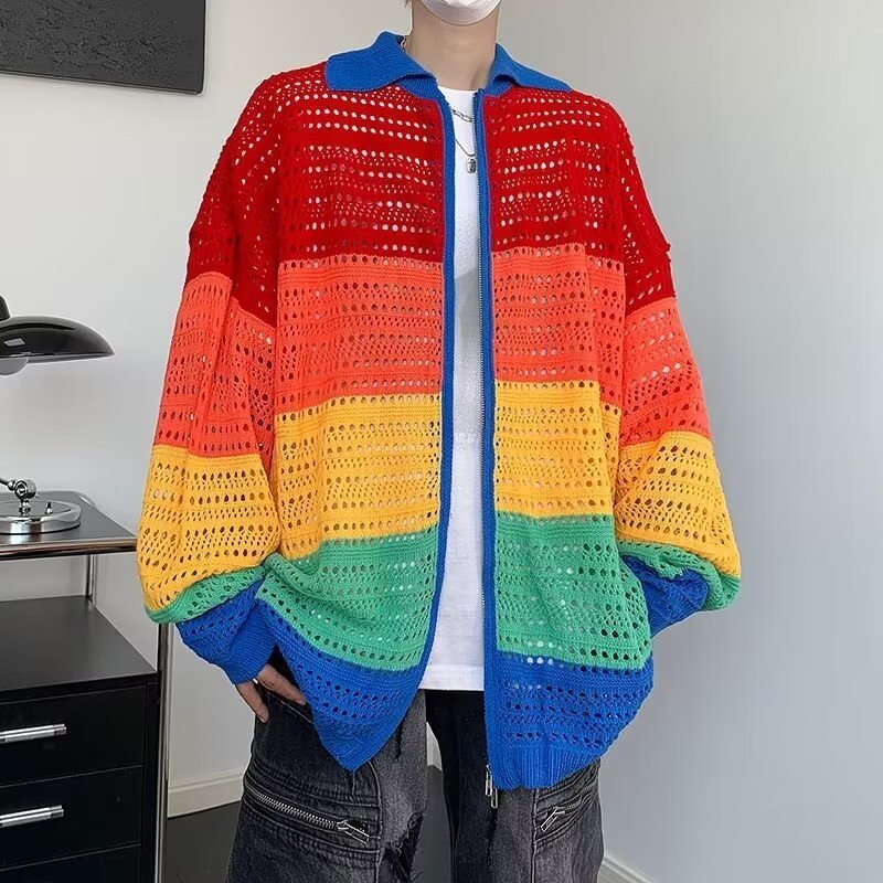 レインボーストライプニットジャケット男潮春秋小大衆デザイン感折り襟日焼け止め服ジッパーカーディガン上着