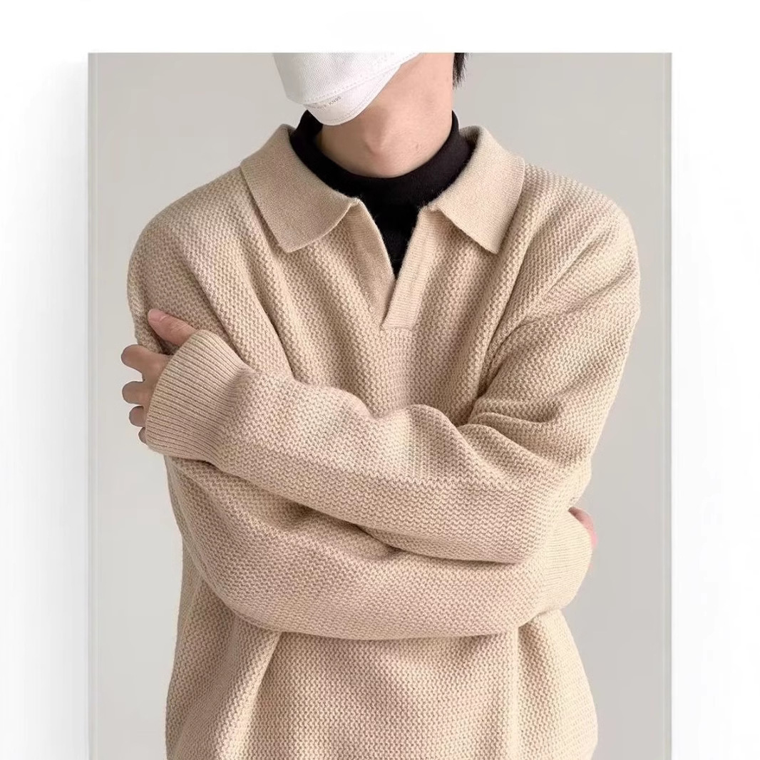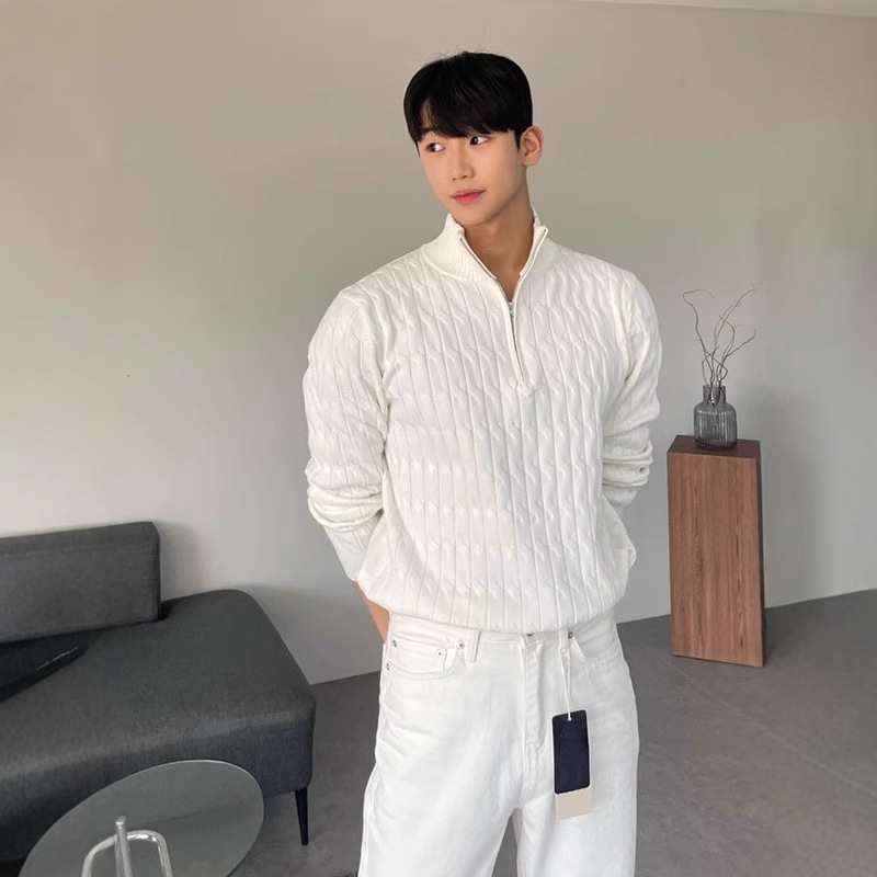 韓国版トレンド半ファスナーセーター男性POLO襟文芸トレンドカジュアル長袖純色ニット上着コート