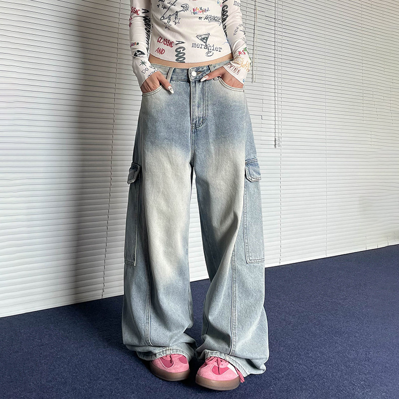 アメリカ式の大きいポケットの工装の薄い色のジーパンの男女のゆったりしている怠惰なまっすぐな筒のレジャーの広い足は洗って古いズボンを作ります。