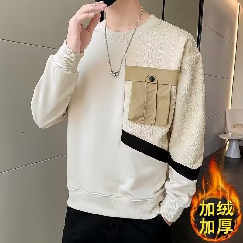 色の丸首の中山の衛衣の男性の秋の新型のファッションのポケットは長袖のtシャツの男性の潮流の底のシャツのTをつなぎ合わせます。