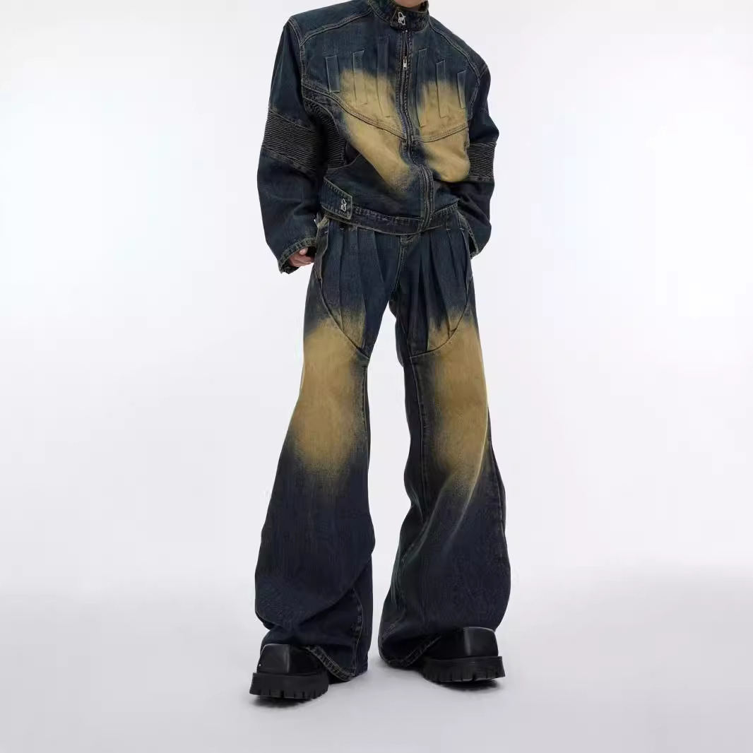 2024レトロな青い水洗いジーンズの男性のごろつきのハンサムな版の春と秋のゆったりした水洗いのまっすぐな筒の広い足のモップのズボン