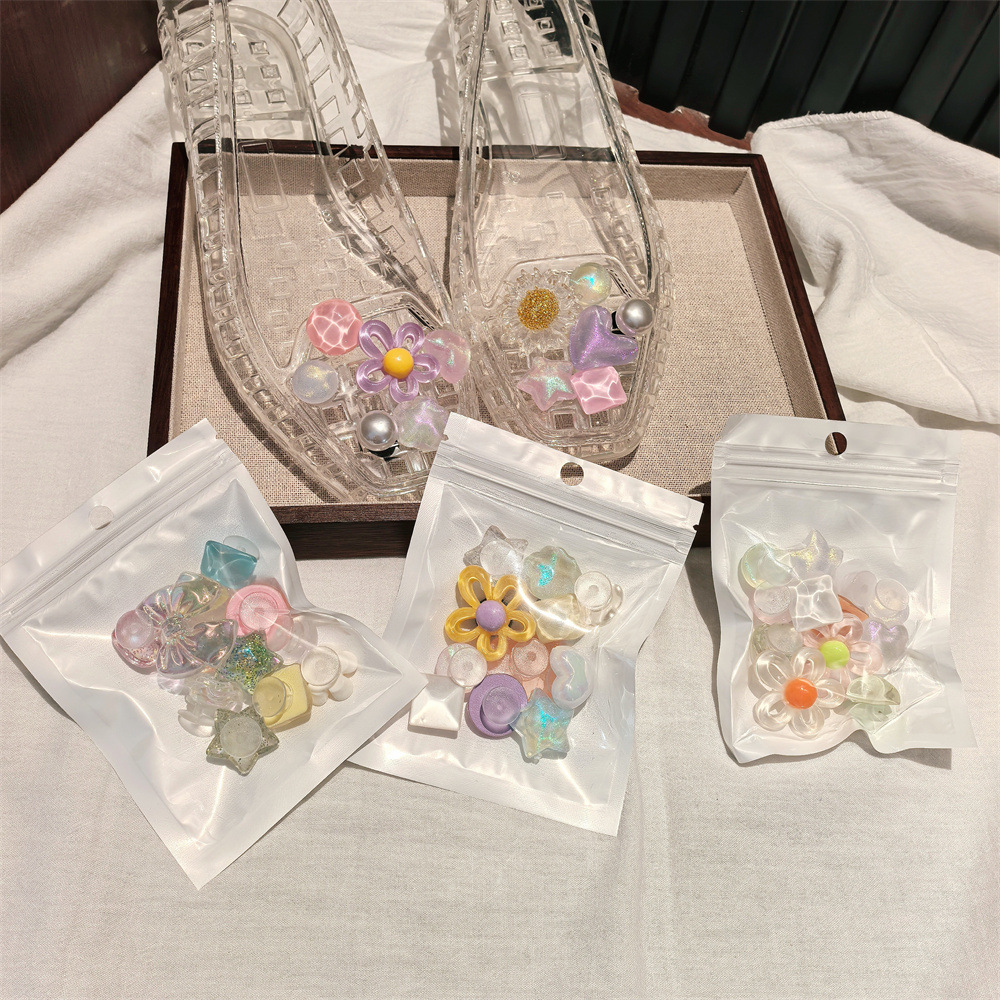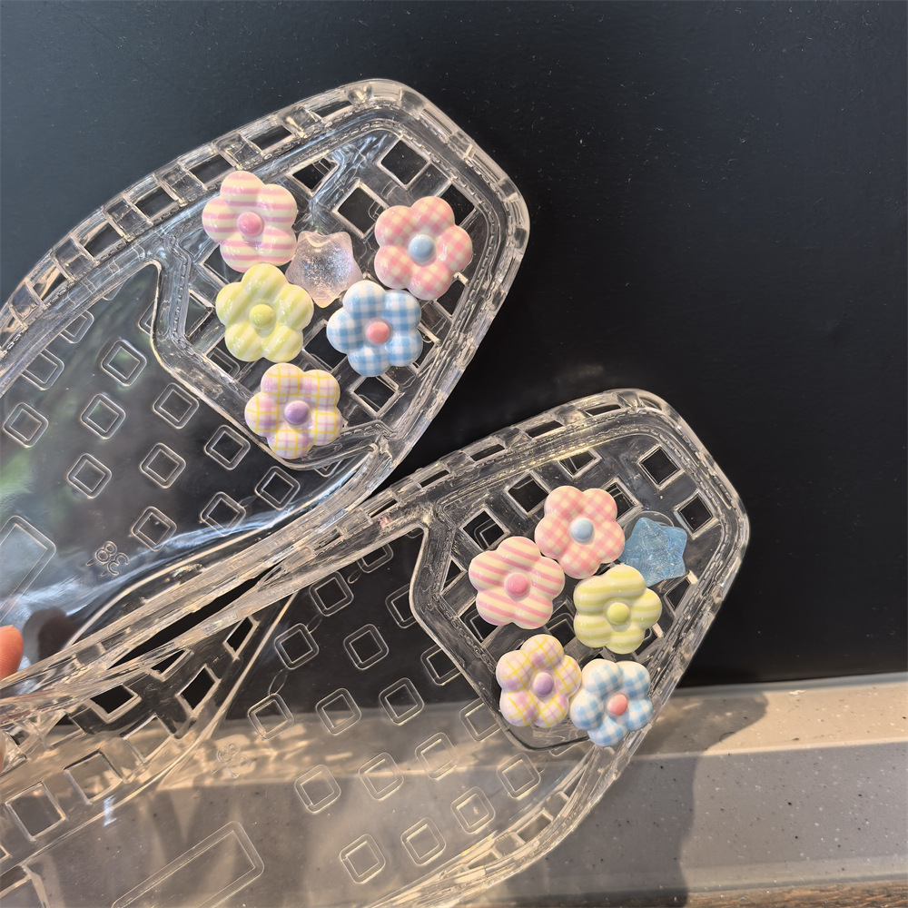 桜の洞窟シューズ、キャンディーカラーの花柄、透明感のある五弁の花、立体的なシューズバックル、取り外し可能な装飾バックル