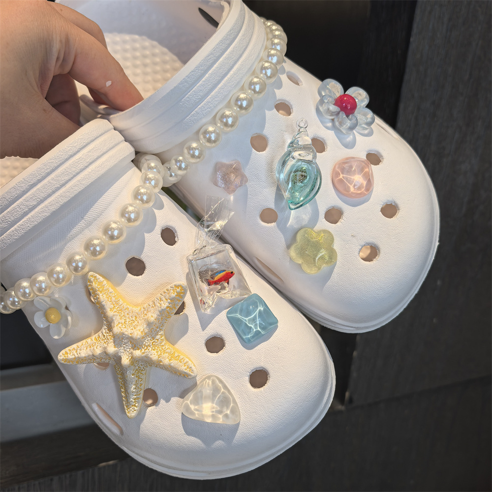 新しい夏休みの海の下駄、高級真珠、ヒトデ、小魚、法螺貝、取り外し可能な靴の花