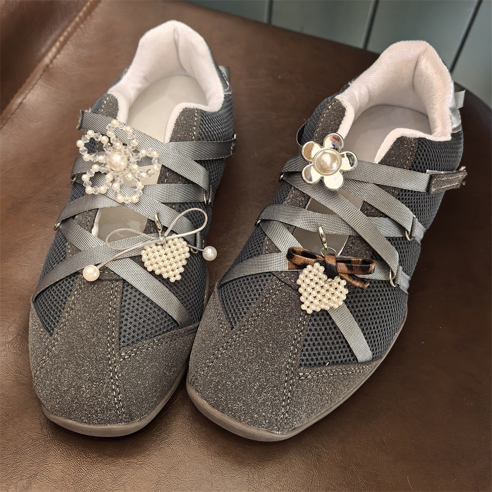韓国のネットの赤い新型の高級感の銀の灰色のバレエの風の運動靴の装飾の靴のボタンy 2kの甘いクールな小さい香ばしい風の靴の花