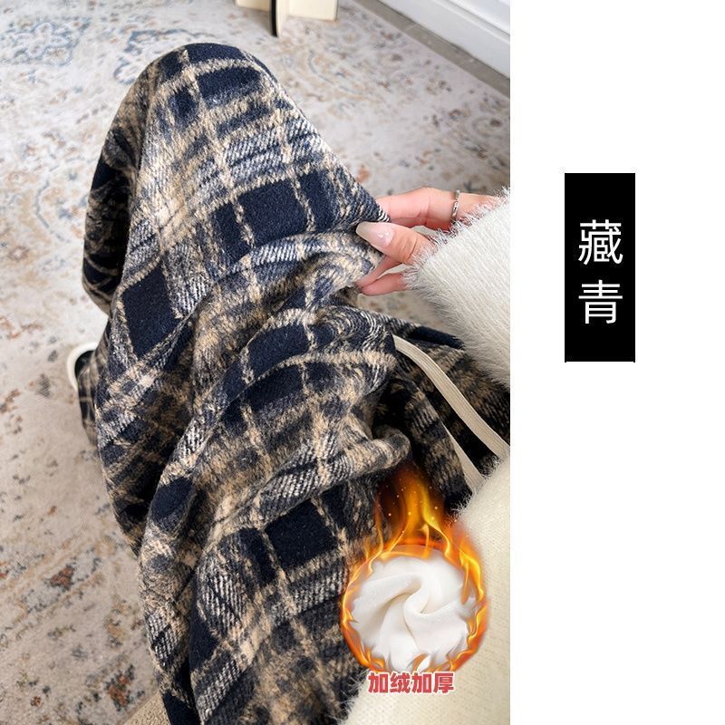 子供の格子のズボンの春と秋の新型の高腰の垂れ下がった感じのカジュアルなレトロなストレートのズボンとベルベットの厚いアメリカのワイドパンツ