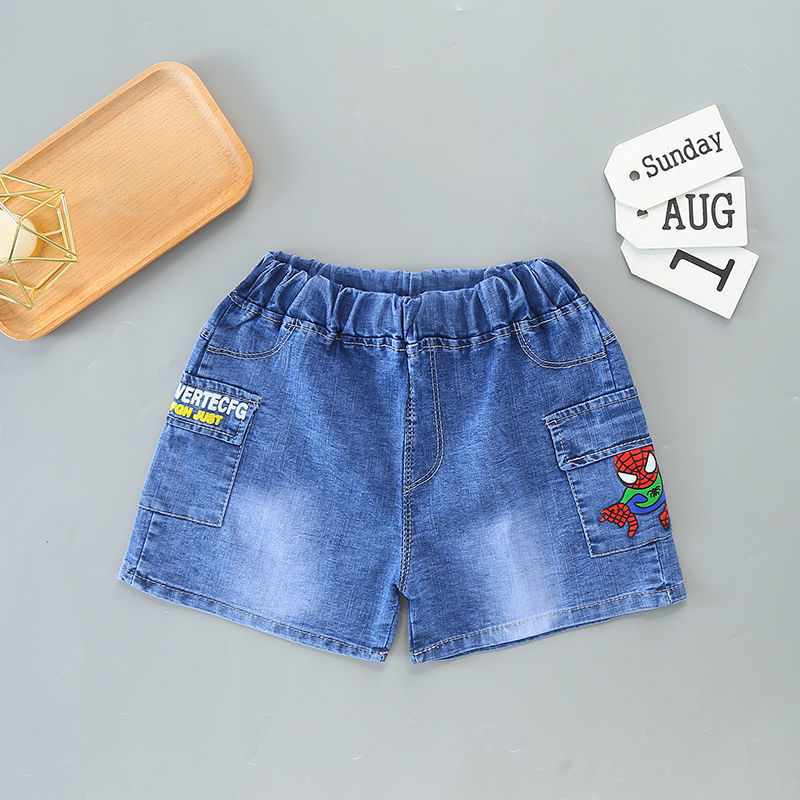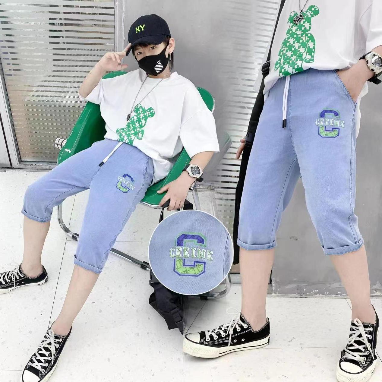 男の子のデニムのショートパンツ2025の新型の薄いショートパンツの夏の子供のゆったりしたファッションの範工装の5分のズボンの対外貿易の卸売り