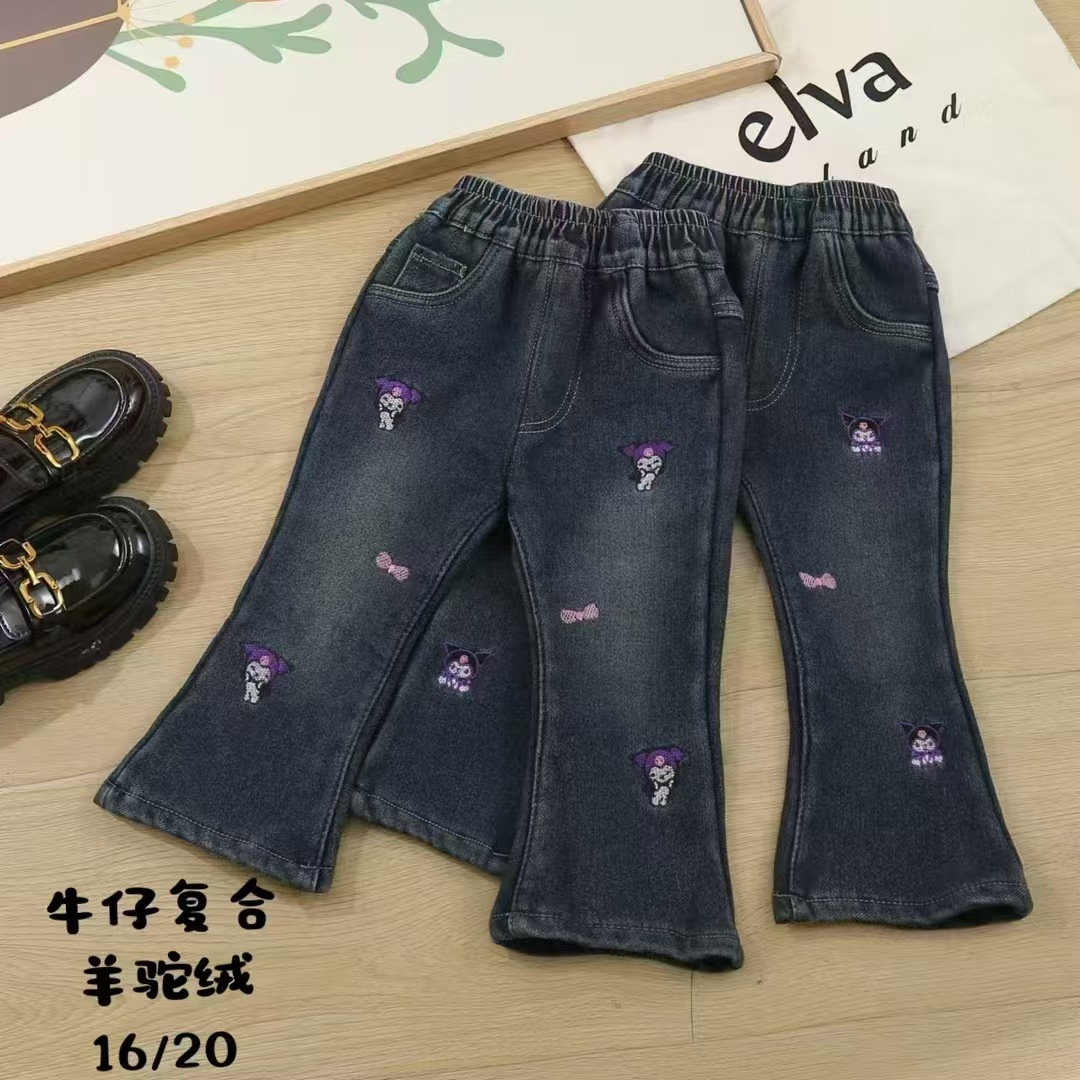女の子のベルベットのジーンズ2024の新しい洋気の女の子の流行のトランペットのズボンの冬の厚い子供の一体のズボン
